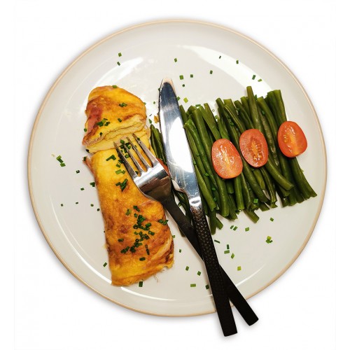 Suggestion de présentation : préparation Omelette Bacon Formage agrémentée de jambon blanc en lamelle, haricots verts cuits vapeur, tomates cerises et ciboulette fraîche.